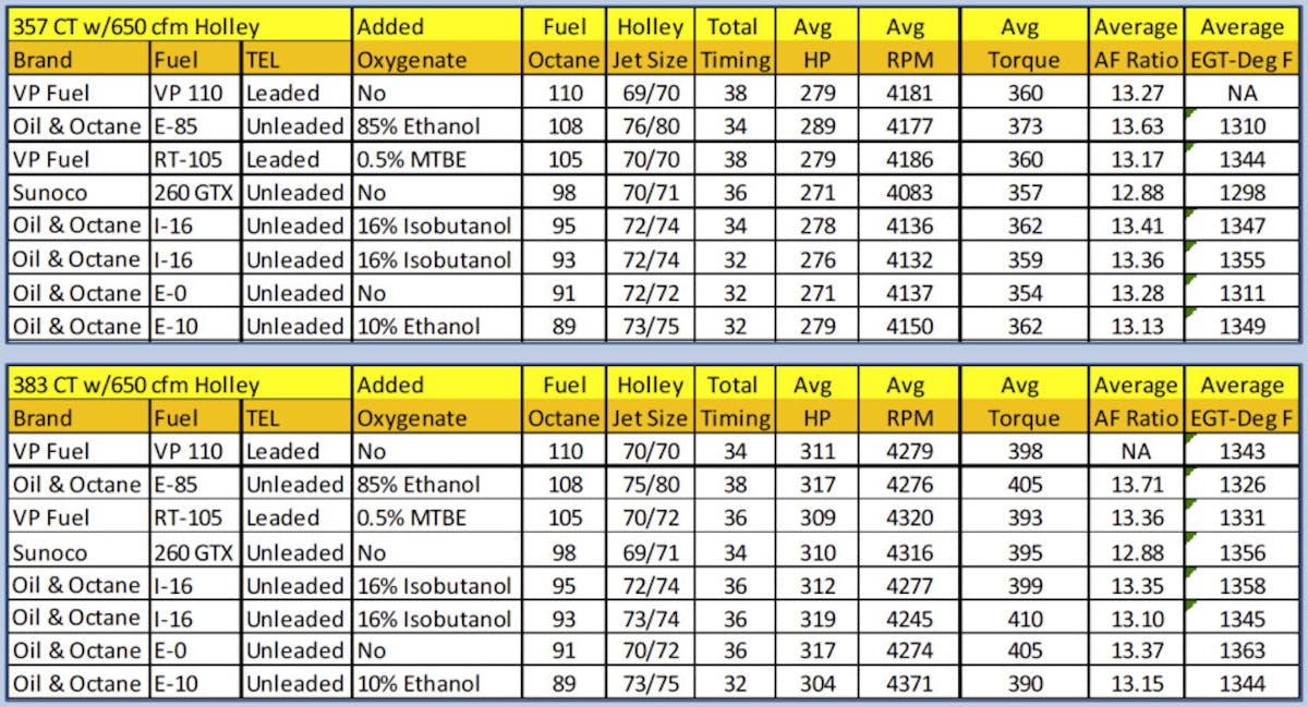 The engine parameters were constant with Quicksilver’s CT engines using 1 5/8-inch headers, a Holley 650 cfm carburetor, 205-degree F thermostat, a 270-degree F oil cooler, and conducted on a programmable engine dyno with computerized data collection. Each engine was allowed a 4-hour dyno break between each different fuel test. This eliminated any chance of “power float” in a fresh engine, as well as fluctuations due to engine temperature variances.