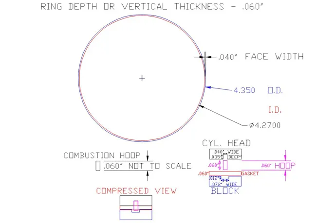 As shown in the diagram below, a typical out-height on a .060-inch-tall hoop is .025 inch, compressing a .060-inch-thick gasket above a .012-inch-deep receiver groove. “We want to not only build up loading in the ring area, but also to contain it with the receiver groove,” says Adelizzi. “The goal is approximately 30-percent more on the ring than the body of the gasket, especially if it’s a dry-deck block. You want a little less — 20- to 25-percent — on a coolant-style block, because you want a better balance between combustion seal vs. gasket body loading, hence no coolant leakage.”