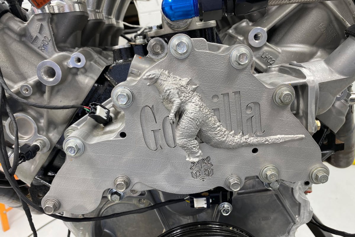 Wolfe’s custom water pump cover says it all: “Godzilla!”