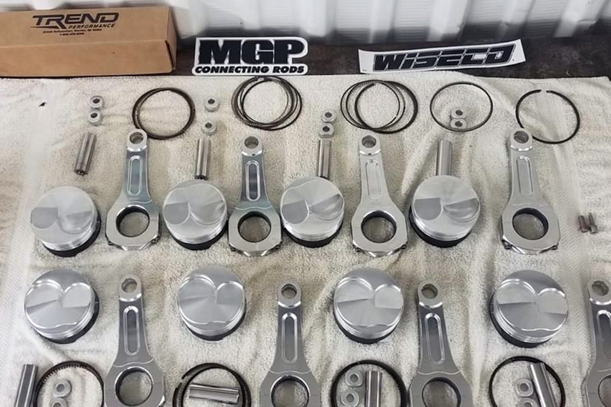 Wiseco 12.5:1 compression pistons (left) with MGP aluminum rods swing on the stock crank in this supercharged Godzilla.