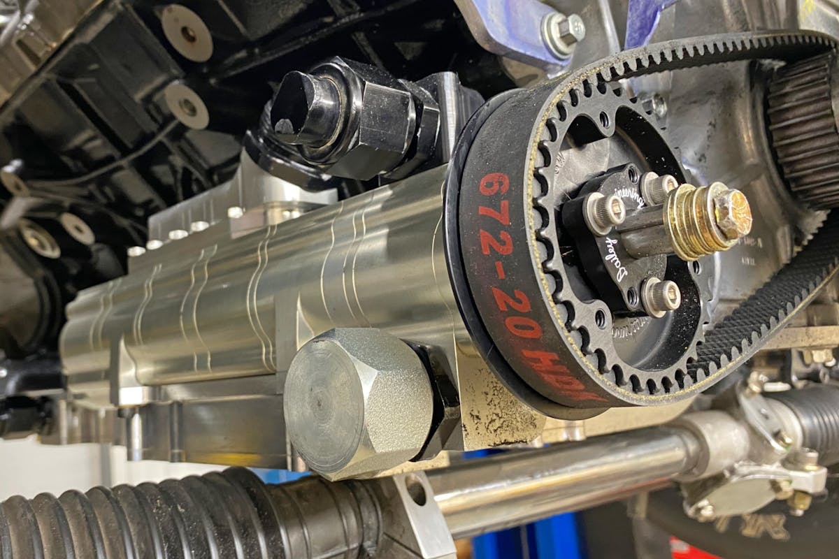 Wolfe chose a Dailey Engineering dry sump system with a low-clearance billet oil pan. The Dailey system is unique in that it scavenges through integrated channels in the pan, not via external lines.