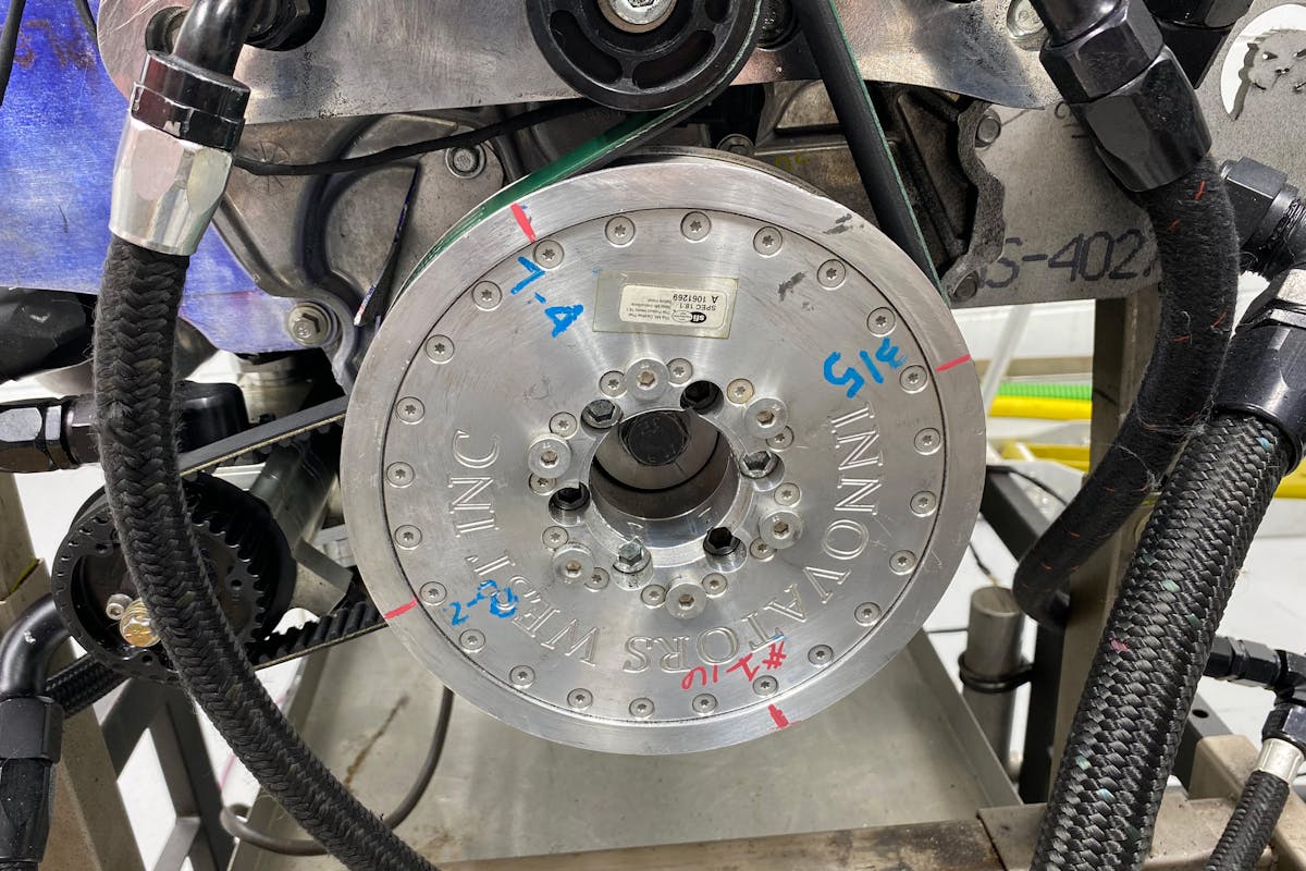 “That’s 1,450 horsepower at 16 lbs of boost,” says Wolfe. “The timing is still a bit conservative, and it didn’t get close to maximum blower speed. I’m happy with the performance of the heads and flow downstream of the blower; this tells me three things. The low boost indicates the valves, ports and valve events are reasonable. The second thing is that I need to get the blower speed up. Lastly, we had some belt slip, so I have to work on that, too.” Wolfe already ordered a 9.0-inch damper and has added Grip Tec finish on all the pulleys.