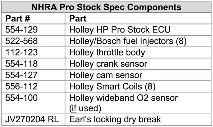 Under the new rules that go into effect for the 2016 season, Pro Stock engine builders will have to use the following Holley parts to develop the fuel and spark system for their engines: throttle body, ECU, fuel injectors, crank and cam sensors and Smart Coils. If the teams choose to use an O2 sensor for closed-loop operation, there is a spec component from Holley on the list. Additional parts such as wiring harnesses, fuel rails, connectors and optional sensors will be available from Holley but not required and teams can build or source their own as needed.