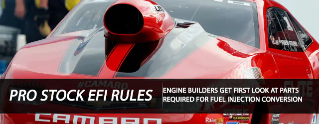 The rules clarification answered many questions lingering since the sanctioning body announced last month that Pro Stock will convert to EFI as part of the division’s most sweeping changes since 1982 when the 500ci rule was introduced. Only eight injectors will be allowed and they must be mounted externally on the intake manifold runners. Also, the throttle body must be mounted forward facing and fit under a stock-style hood. The iconic but rather noticeable hood scoop on current Pro Stock vehicles will be eliminated. Air intake will be drawn from an opening in the front grille. GM and Mopar must submit the location and dimensions of the proposed openings for their body styles to NHRA for approval before competition begins next season.