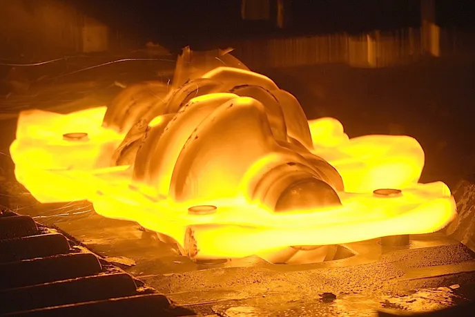 Here’s a crankshaft forging still glowing after the hot steel ingot was pounded into shape. Note the wide parting material leftover that has to be removed. ThyssenKrupp AG photo