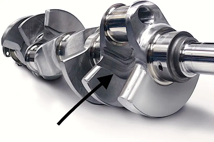 A smooth radius between the journal and the counterweight, commonly referred to as the fillet, is important as this area is under considerable stress, and a smooth transition can minimize potential for cracks or stress risers developing.
