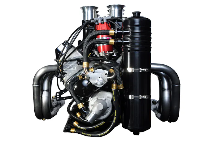 Finally, the lubrication system starts with a Dan Olson pan designed to ensure proper ground clearance. Three scavenge lines lead to the oil pump, with an additional line scavenging from the lifter valley. A total of only 8.5 quarts of oil are kept in the dry-sump reservoir to help keep the overall weight down.