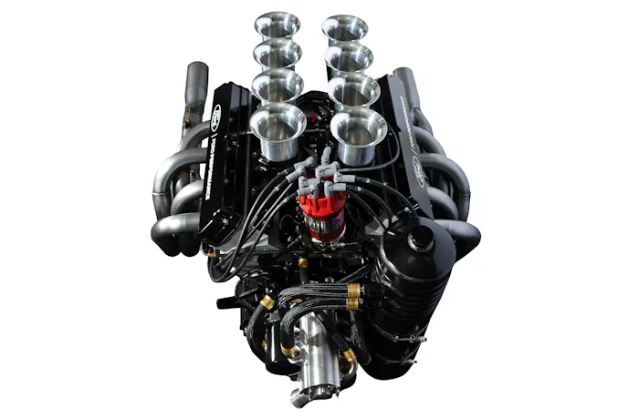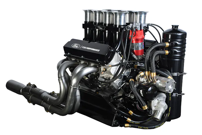 Development efforts started with the cylinder block. Ford had an aluminum 351 Windsor block in its performance catalog that had been used for a variety of motorsports, but the team targeted two key areas for improvement. First, increasing cylinder pressures necessitated four additional head-stud locations, totaling 14 per side and giving each cylinder a five-bolt pattern. The second goal was to reduce mass, so titanium main caps were sourced.