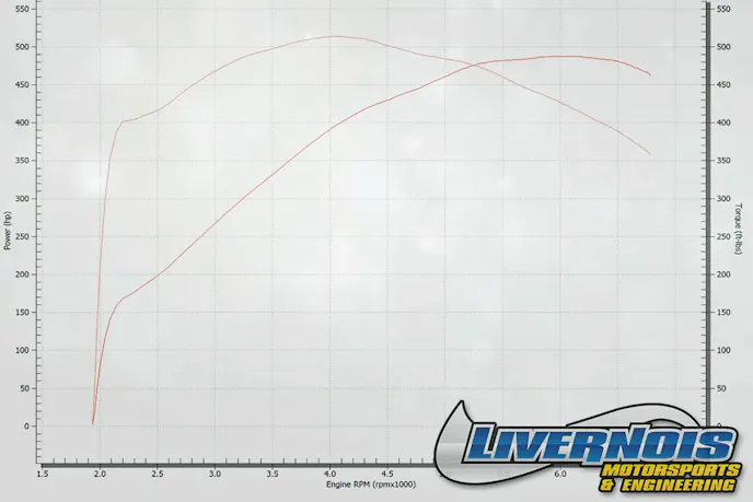 With all the upgrades in place, the car was strapped back onto the Livernois dyno, and after some quick tuning for the new components and the deleted MDS, we were rewarded with new peak numbers of 487.6 horsepower at 6,060 rpm and 513.6 lb-ft of torque at 4,060 rpm. That makes for a peak power increase of 54.1 horsepower and 60.7 lb-ft of torque.