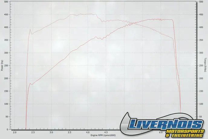 Before the team at Livernois Motorsports started tearing into the engine, the car was strapped down to the chassis dyno. The Challenger posted peak baseline numbers of 433.5 horsepower at around 5,780 rpm and 452.9 lb-ft of torque at 3,800 with a little torque plateau from 3,600 rpm to about 4,300 rpm.