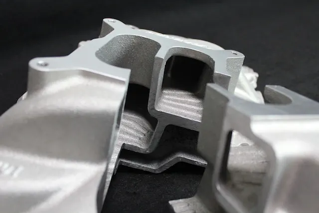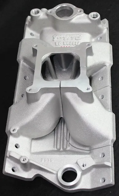 “On some of our dual-plane manifolds, we will cut down the center divider; it varies from one manifold design to another,” explains Smith. “The amount that the divider is cut down isn’t determined by numbers on a dart board. This is all based on dyno testing and flow testing by our engineers. What this does is help balance the air signal to the carburetor for the air/fuel mixture at higher rpm. This technology goes back as far as Vic Edelbrock, Sr, and the old slingshot manifolds on flatheads.”