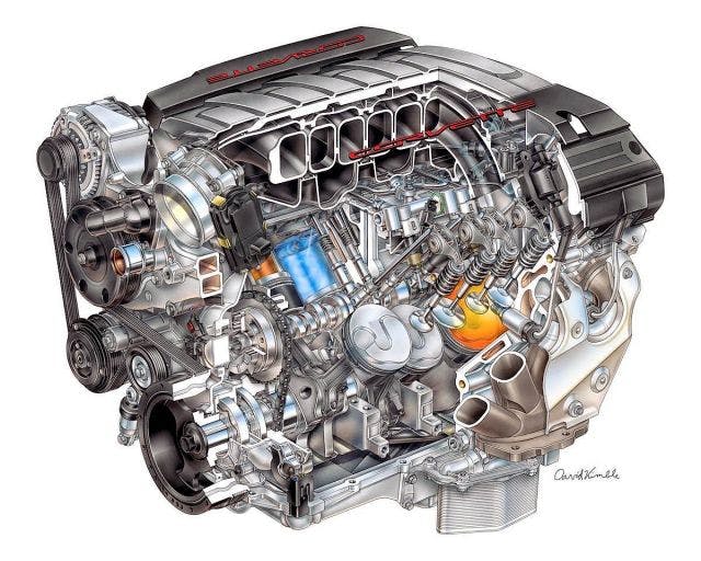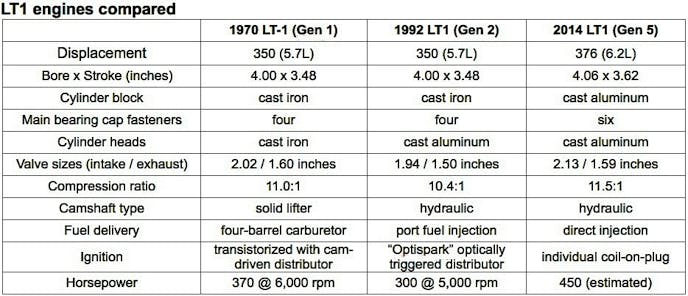 While GM says the LT1 is a clean-sheet design, some traditional design elements found on every Chevy small-block since 1955 continued into the fifth generation, including a 90-degree V block with a single camshaft, two valves per cylinder and the trademark 4.400-inch bore-center spacing.