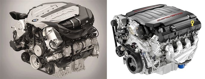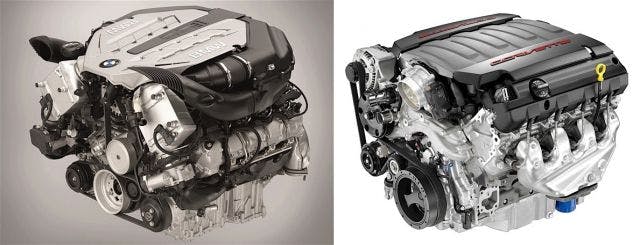 First there was horsepower per cubic inch, then came area under the torque curve. Now the trending measurement is power density, which helps rate an engine’s efficiency and size. GM has made available numbers to compare the new LT1 with a BMW 4.4-liter twin-turbo found in the 5 Series. The BMW is rated at 400 horsepower with 450 lb-ft torque and has a weight of 503 pounds, or in simple terms, .795 horsepower per pound. The LT1 is likely to be rated at 450 horsepower and 450 lf-ft torque with a mass of 465 pounds, or .968 horsepower per pound. According to GM, the LT1 is also 4.3 inches shorter in overall height than the BMW.
