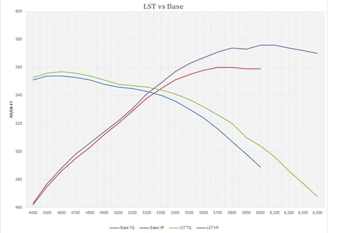 The combination of those benefits from the LST cam improved power on our LS engine by more than 16 horsepower and our LS engine test did not increase valve lift. If the heads on your engine can accommodate the additional airflow, this could easily be worth 20 horsepower — or more — on a good, large displacement small-block.