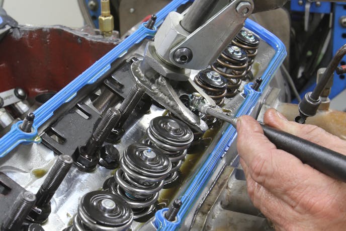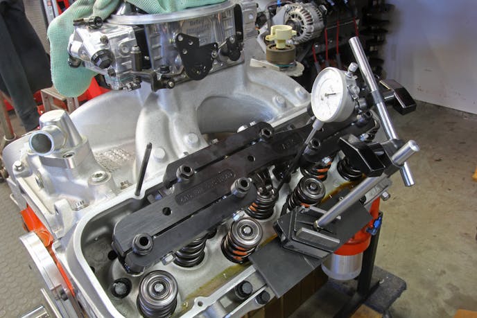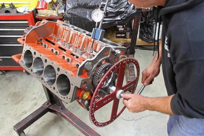 Ex-303 272 0714 0.016”* 23375This particular big-block sports 10.5:1 static compression with a relatively tight 0.045-inch piston-to-head clearance, and with the initial roller cam, we measured barely 0.050-inch of intake-valve-to-piston clearance. With a more aggressive closing side low-shock lobe, this could easily push our piston-to-valve clearance way too tight. For this reason, Godbold recommends adding lobe separation angle to the cam with an additional two to three degrees. The original cam offered a 108-degree LSA while this new low-shock cam would probably best be spec’d with a 110- to 111-degree LSA.