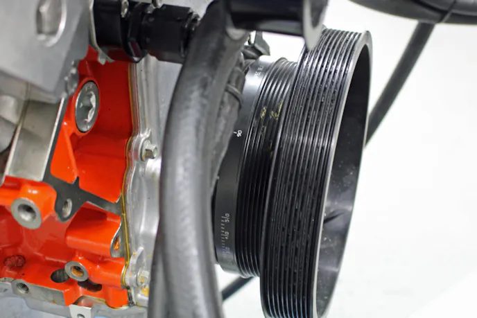 At that point, everyone agreed there wasn’t much more to be done, as the belt slip was getting extreme at that point, because of how hard the massive crank pulley was over-spinning the F-1X blower. That is, until someone noticed that the ProCharger tensioner could be clocked an additional 120 degrees, putting a significant amount more tension on the belt.