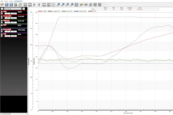 At that point the injector duty cycle was getting deep into the nineties, and timing hadn’t even been touched yet. So for the next run, Bell commanded an increase in base fuel pressure to get some additional breathing room on the duty cycle, and added two degrees of additional timing, coupled with adding 1,000 rpm of engine speed, running the engine up to 7,500 rpm.