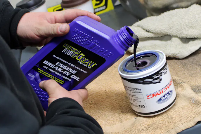 One of the first things that had to be done, was an initial break-in of the Coyote. With the compressed timelines, MPR hadn’t had a chance to break the engine in prior to shipping it to Westech, so that fell to us. We grabbed a case of Royal Purple 10W-30 break-in oil, filled the engine and oil filter up, and disconnected the blower charge pipe. Contrary to Royal Purple’s normal performance oil, the break-in oil uses highly refined mineral oil as a base, and is then fortified with zinc and phosphorus additives traditionally found in break-in oil. The formulation is designed to promote proper seating of the rings in the cylinders, while the followers and cam lobes wear in with one another.