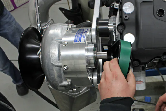 Unfortunately, the shorter belt that was obtained from the parts store down the street to try and cure the belt slip, was just a regular 8-rib belt, and broke in exciting fashion only 300-rpm into the next run. We had no choice but to go back to the larger pulley. So the F-1A-94 got the 4.50-inch pulley and ProCharger-brand 8-rib belt reinstalled.