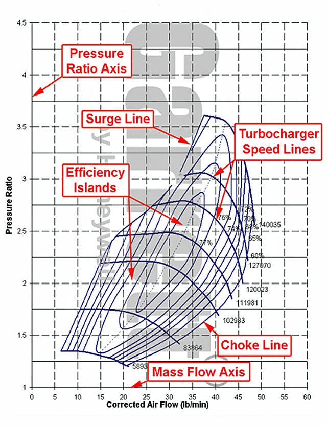 When looking at a compressor map, you’ll notice that what you’re really looking at is a two-dimensional graph, and on the X-axis you have Mass Airflow (as we calculated above) and the Y-axis represents Pressure Ratio. Within those confines you will find efficiency islands, speed lines, a surge line and a choke line that each represent important aspects of a specific turbocharger’s “personality.”