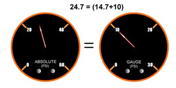 Absolute pressure (psia) is the atmospheric pressure of your environment added to the amount of gauge pressure being produced. Since our small-block Ford is being operated under standard sea level conditions, our atmospheric pressure will be equal to 14.7 psia.
