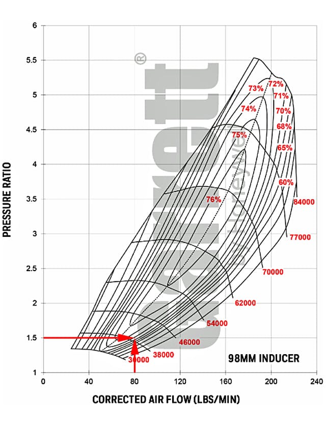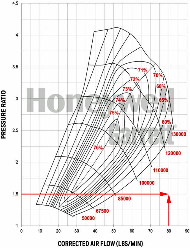 This tells us that to get our “built” theoretical 302 ci small-block Ford to 800 horsepower we need to find a compressor housing that is capable of efficiently moving 80 pounds/min of air at a P/R of 1.5, or ideally a nice twin turbo setup, but that would be another article all together. So, to find the right turbo for our engine, we need to examine the compressor map for each turbo we may want to use.