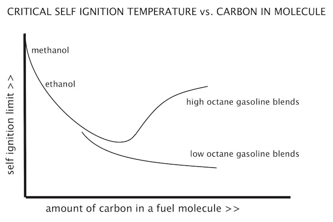 In the other direction, less enrichment beyond a certain optimum air/fuel ratio tends to increase the auto-ignition sensitivity. With methanol or ethanol, less enrichment will not cool the cylinder temperature enough, raising temperature enough to where the engine may then detonate, especially if high compression ratios are used.