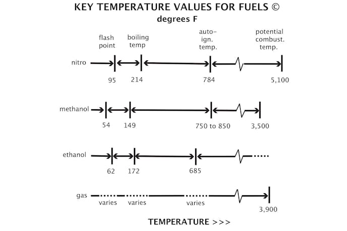 Some nitro tune-ups may be more prone to detonation when leaning the mixture (higher air/fuel ratio). Some nitro tune-ups may be more prone to detonation with enrichment of the mixture (lower air/fuel ratio). The best tune-up routine is to make as few changes as possible to engine compression, boost, fuel mixture, fuel temperature, and others to dial-in engine power for the performance envelope. Making multiple changes from run to run makes it almost impossible to get control over the tune-up, because of that wandering auto-ignition temperature characteristic. Major engine failures can occur as a result.