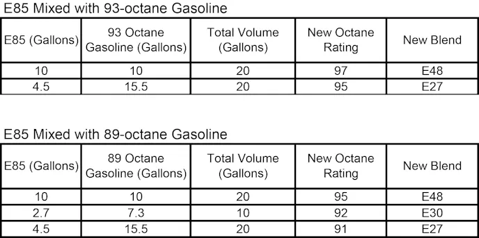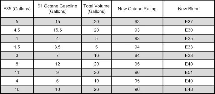 Simply put, if you mix 5 gallons of 91 octane pump gas with 5 gallons of E85, you get 10 gallons of a 96-octane fuel that’s very close to E50, or 50-percent ethanol and 50-percent gasoline. (If we’re being pedantic, it actually computes to E48.) The best part is that for most of the country, E85 costs approximately one dollar less per gallon than pump premium.