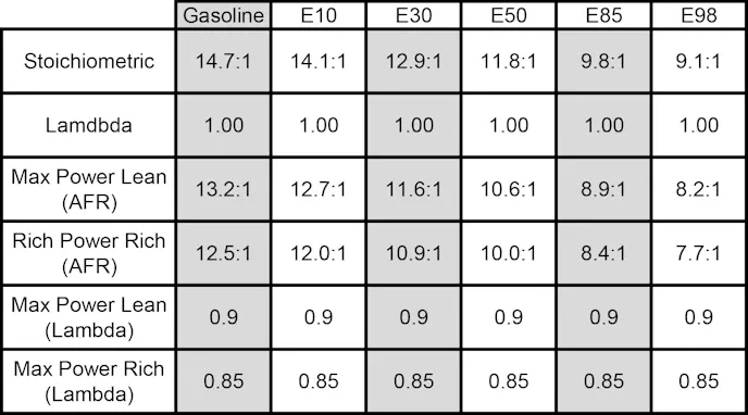 In our accompanying chart, you’ll see that any addition of ethanol in the fuel (including the 10-percent added to nearly all pump fuel), affects what is called the stoichiometric air-fuel ratio of gasoline. Pure gasoline has a stoichiometric ratio of 14.7:1. Add 10-percent ethanol and that ratio drops to 14.1:1. Even a mild E30 change moves the stoichiometric number from 14.7:1 to 12.9:1. This can get confusing very quickly.