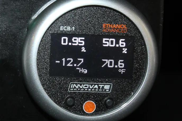 One way to easily test the fuel percentage to make sure we mixed it properly is with Innovate Motorsport’s gauge package that reads ethanol content as well as delivering the air-fuel ratio from an oxygen (O2) sensor. Here’s where it gets tricky because the numbers from the O2 sensor will not be accurate.