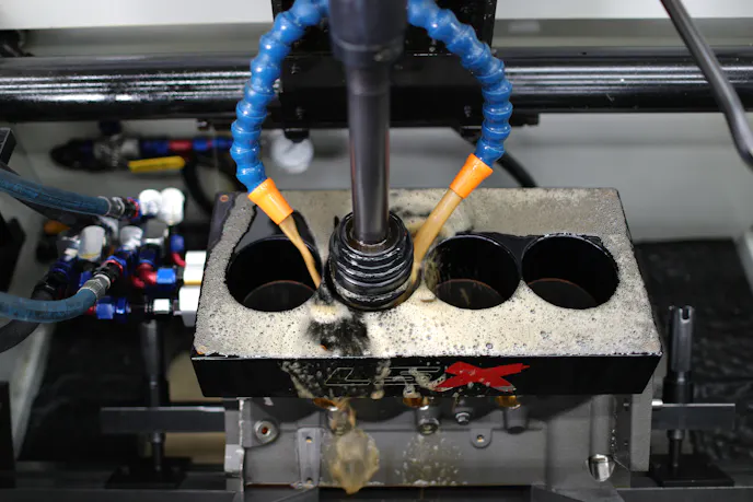 The service entails the block being honed normally until slightly under the desired final bore diameter. From there the block is pumped full of 150-degree coolant, bringing it, as well as the honing stones, up to temperature, in order to induce thermal expansion prior to honing. The block is final-honed at the elevated temperature to ensure the bores are as straight as possible when the engine is at operating temperature.