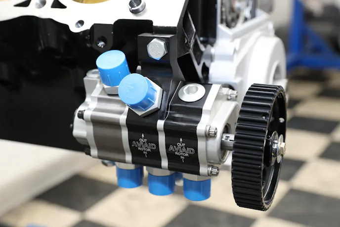One trick of the trade when it comes to freeing up horsepower and reducing windage is a dry-sump oiling system. Aviaid manufactures several kits designed specifically for the LS platform, including direct-fit oil pans and pumps. We opted for Aviaid’s three-stage LS “C” Series 2 kit. Dual pan pickups scavenge the oil out of the pan and route it to the kit’s 2.5-gallon tank. The ATI damper included in the kit has a splined hub to drive the oil pump off the backside, minimizing accessory overhang.