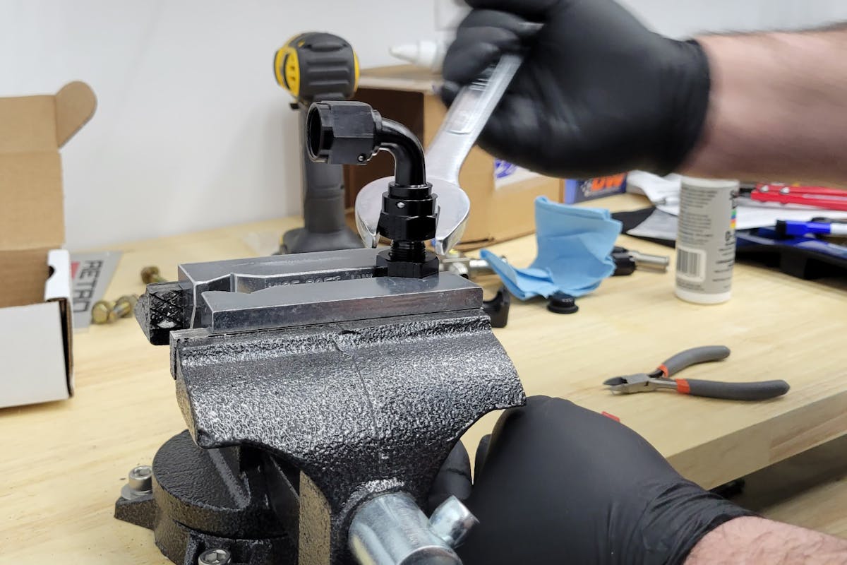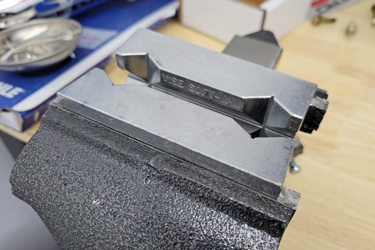 The next tools you’ll need are a bench-mounted vise and a set of aluminum vise jaws. Since the fittings are all aluminum, and the jaws of a standard vise are steel, you can mar the finish of the fittings, without a set of soft jaws. A number of vendors sell aluminum vise jaws made specifically for AN fittings, that have 120-degree notches to securely hold the fittings on four sides instead of just two. Between the soft material and the increased support, the fittings come out unscathed.