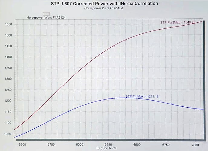 After a quick SuperFlow break-in program run on the dyno, some validation pulls were made with the engine without the supercharger on it, which looked promising. Then the supercharger was bolted on, and the test sweep set for 5,500 to 7,000 rpm.