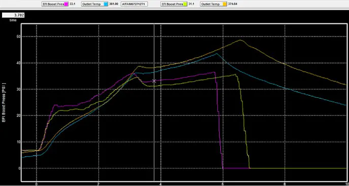 “We ran pass one, removed the stock volute and then installed the Morris volute. We then ran pass two. We saw a 2-3 psi boost increase and a 10-15 degree temperature decrease across the board. Performance wise, we dropped from 5.17 to 5.03 and gained 2 mph,” says Reid.