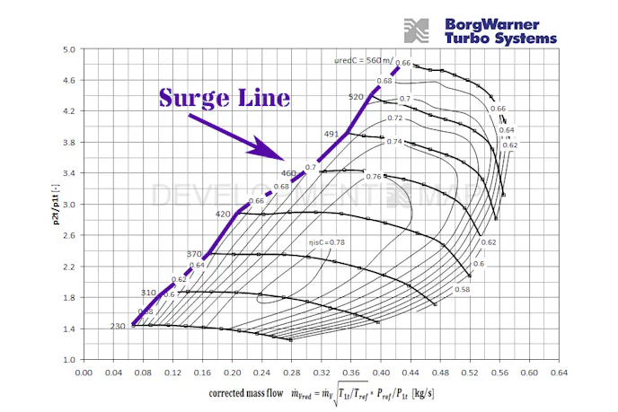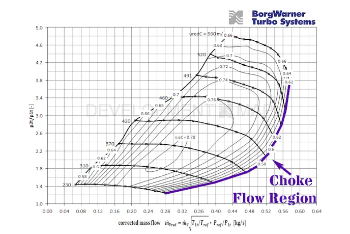 “Compressor maps are typically shown as contour plots, with the islands representative of the compressor stage efficiency. There are critical areas to be aware of on a compressor map. The two areas that can cause damage to a turbocharger are the surge and choke areas,” said Jim Rufini, Applications Engineer for BorgWarner.