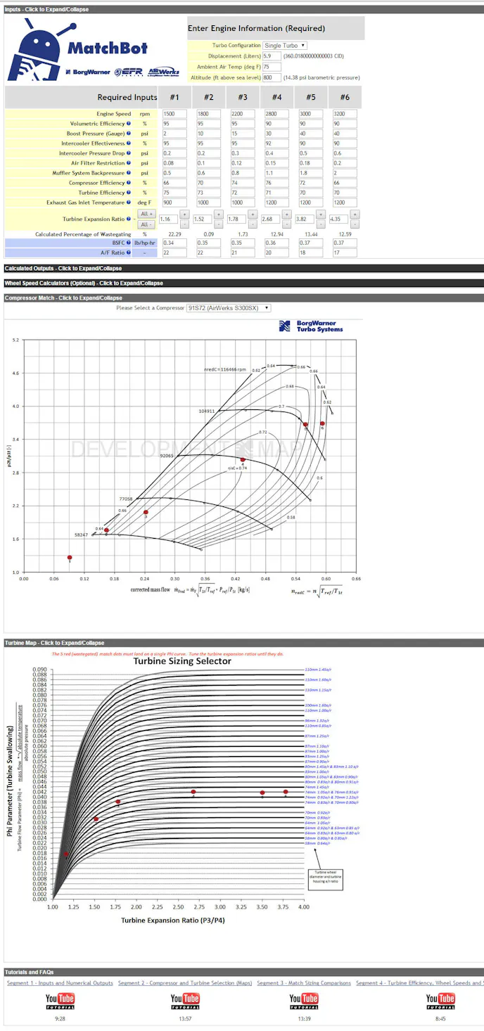 Now if you don’t want to go through all of these calculations by hand, there is a matching tool that will calculate all of the information for you. All you will need to do is input some basic information. The matching tool is called MatchBot. It is an online turbocharger matching tool that BorgWarner created a few years ago. It is pretty encompassing, but there are lots of information tabs, and rules of thumb you can use to get a good ballpark.