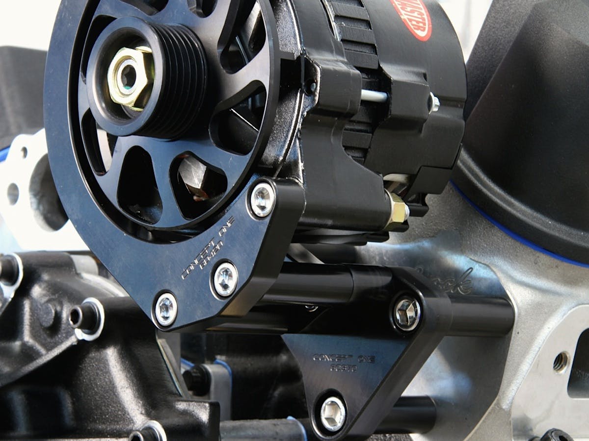 The Concept One system is a gem of stylish appearance and rugged efficiency. The brackets are CNC machined out of billet aluminum and available black anodized, which promotes the engine’s color theme. The kit is complete with pulleys, black-anodized spacers and chromed socket-head hardware. It also comes with a matching Powermaster alternator and fan, Goodyear Gatorback belt and OEM spring tensioner. Installation was quick and easy — a claim that likely could not be made if the parts were sourced from a salvage yard. All the pulleys lined up, and video from the dyno tests showed the belt worked perfectly. Concept One offers a variety of kits in different finishes and to support different accessory arrangements. With Fords, there’s also the issue of long and short water pumps. The company provides precise drawings with measurements to help engine builders select the right components, and there are also numerous options for those applications requiring A/C compressor and power-steering pumps.