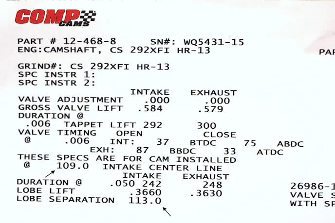 But looking at a COMP small-block street cam (P/N: 12-468-8; right cam card), it has an intake centerline of 109 degrees ATDC, but the lobe-separation angle is 113 degrees. This means this cam is machined with 4 degrees of advance already built-in. This also means the engine builder should install and degree this cam “straight up” — with no advance — because the intake lobe has already been advanced. Adding more advance would only hurt power.