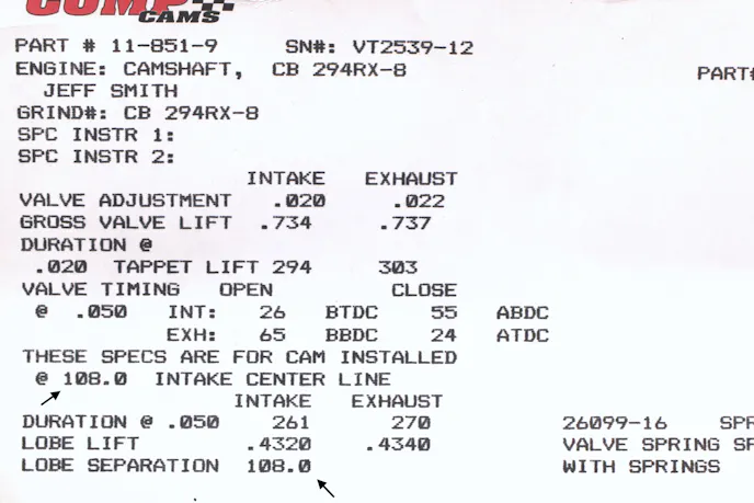 For example, a COMP Cams mechanical-roller for a big-block Chevy (P/N: 11-851-9; left cam card) lists the intake centerline at 108 degrees and the lobe-separation angle at 108 degrees. This means this cam is ground “straight-up” without advance.