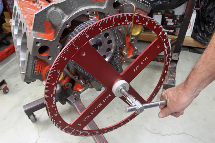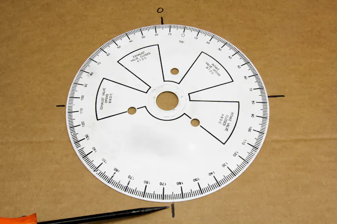 It doesn’t make sense to stress over one-degree of intake centerline changes if your degree wheel isn’t accurate. Small-diameter degree wheels can be a bit off, so here’s a quick way to check accuracy. Trace a circle around your degree wheel with a Sharpie on a large cardboard box. Mark the four 90-degree positions on the circle: 0 – 90 – 180 – 270. Now turn the wheel away from the 90-degree mark. We used 15 degrees BTDC at the top.