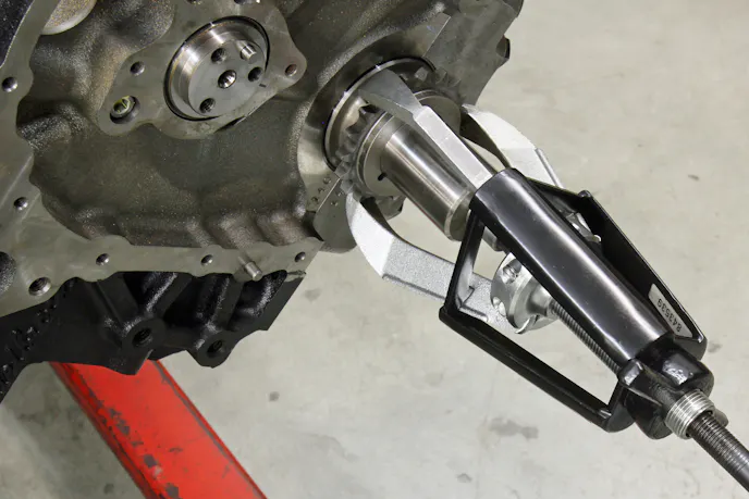Later, we discovered this nice Posi Lock three-jaw puller (P/N: 104) works very quickly and easily. This unit uses a locking mechanism to positively position the three jaws. It has a 4-inch reach and a 5-inch spread with a 3-ton capacity. You can find these pullers on Amazon for just under $120. We’ve used this tool on small-block and big-block Chevy engines, and it will also remove GM factory LS harmonic balancers.