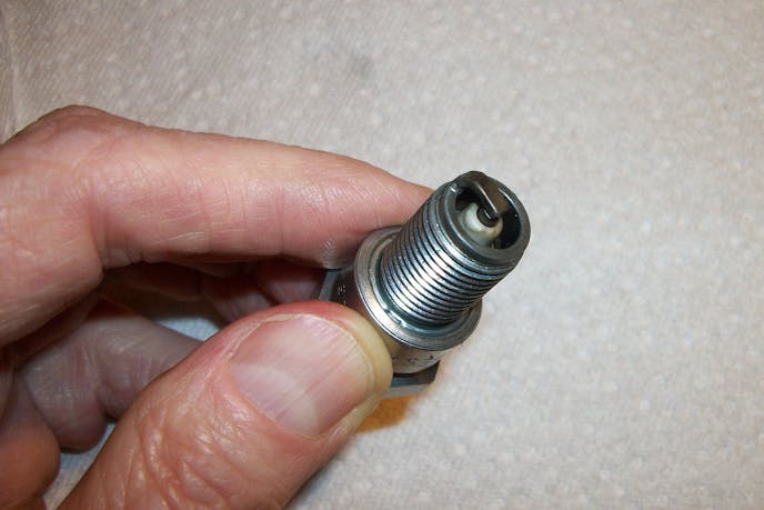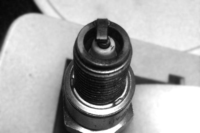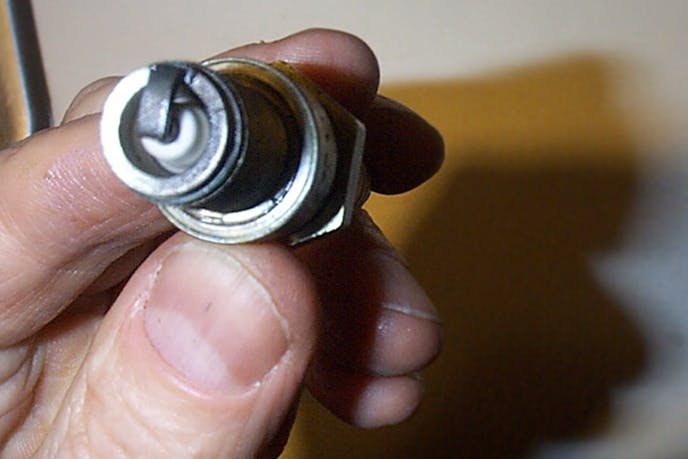 The spark plug has several sections to read to determine the engine tune-up: the porcelain, the housing ring around the porcelain, the strap or outer electrode, the center electrode shape, and the threads. The porcelain is the insulator between the center electrode and the spark plug housing. On a new spark plug, it starts out white. After a test run, the spark plug can be examined with the naked eye or under a magnifying glass for minute particles, cracking, or surface bubbling.