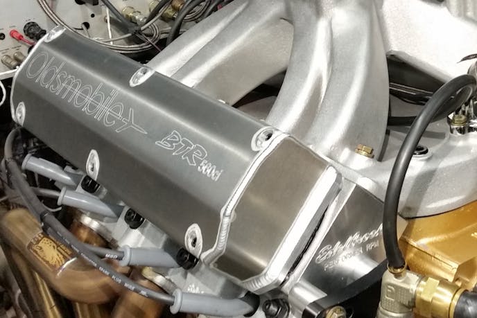The intake now has Dominator flange and has been welded up for increased flow, the ports were moved, some port taper was added, the plenum floor was lowered, and more. Because it’s an Olds application, this custom intake was developed exclusively with BTR.