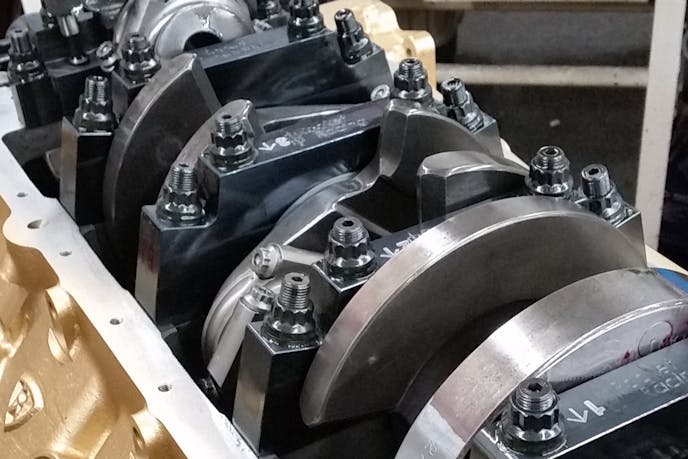 So, what happens when we give Bill Trovato a Rocket Racing block? We get 560 cubic inches of angry Oldsmobile. Bill started with a 4.400-inch bore and teamed it with a 4.600-inch billet crank from Sonny Bryant. He shared with us that the center counterweight is the key to this long-stroke crank not beating up the Swaintech-coated bearings.