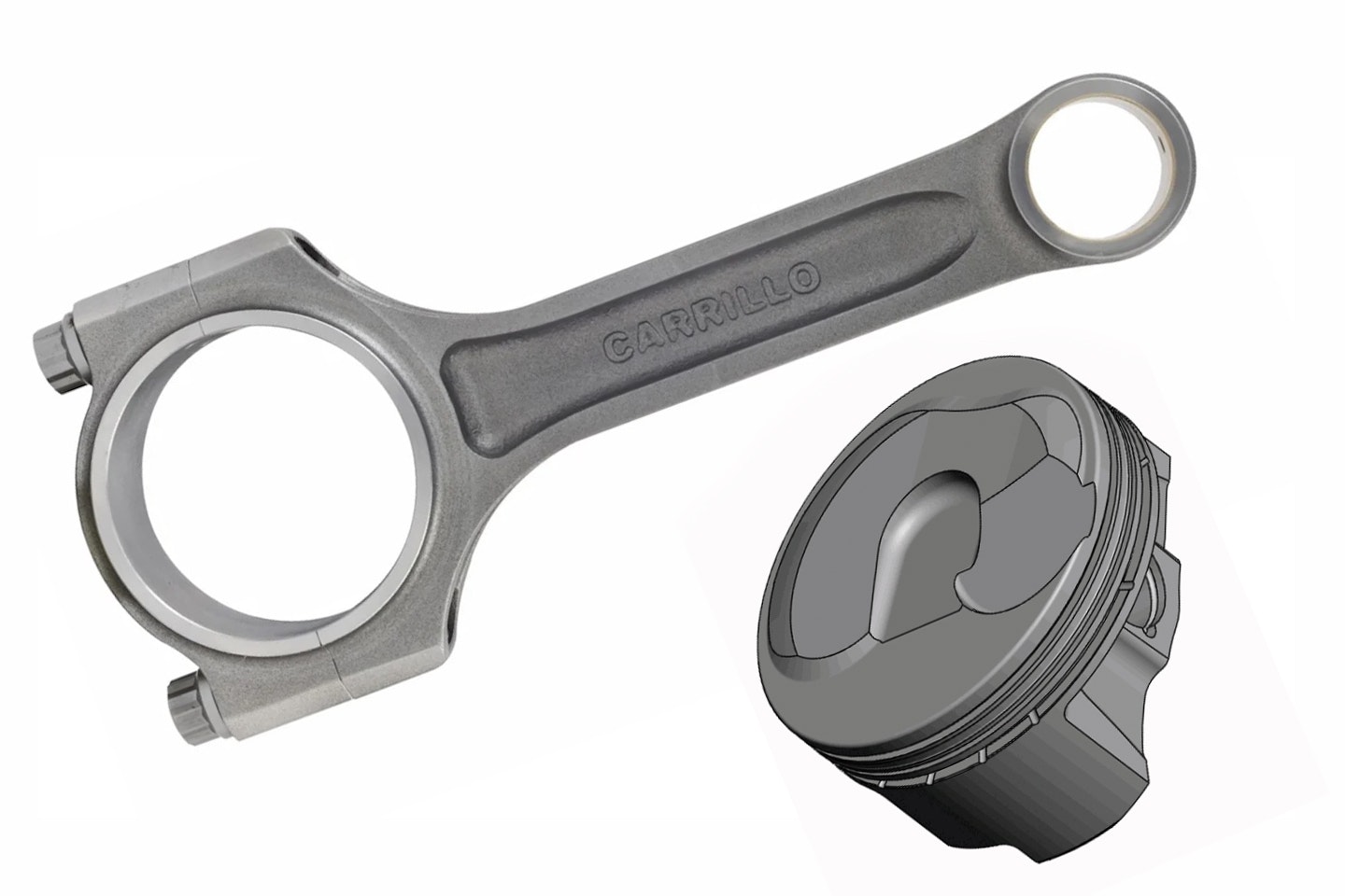 The Bullet Pistons are made out of forged 2618-T6 aluminum and come with a 1.5mm, 1.5mm, 3.0mm ring package. The DI pocket is based on the factory version but has been slightly altered in order to reduce compression to a slightly more boost-friendly 10.5:1 (with 58.2cc heads) while still matching the DI spray pattern and still maintaining the fuel distribution, which also still helps the emissions, according to Cindy Verkooij, director of sales and marketing for CP-Carrillo.