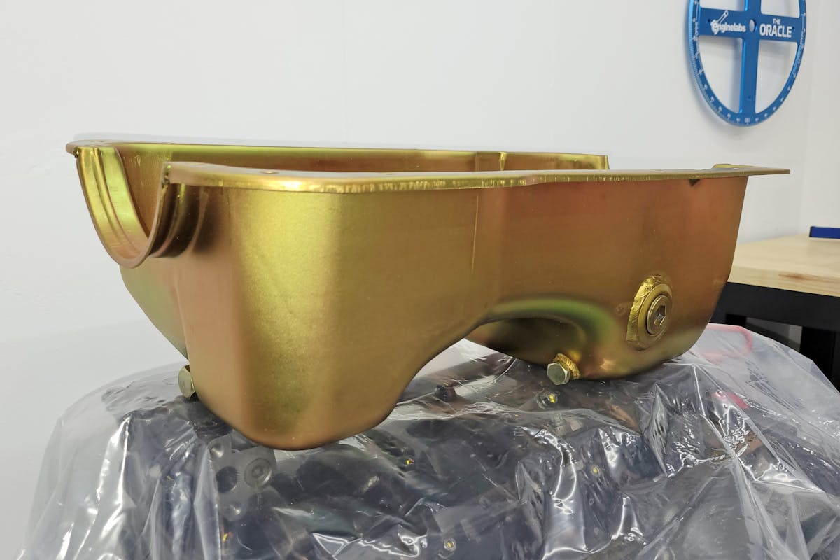 This pan not only keeps the factory look of our project engine, but it also adds a little bit of pizzaz with some additional oil control. Not to mention we’re already eyeballing that low-oil-level sensor port for an oil return line for our soon-to-be-disclosed choice of power adder.