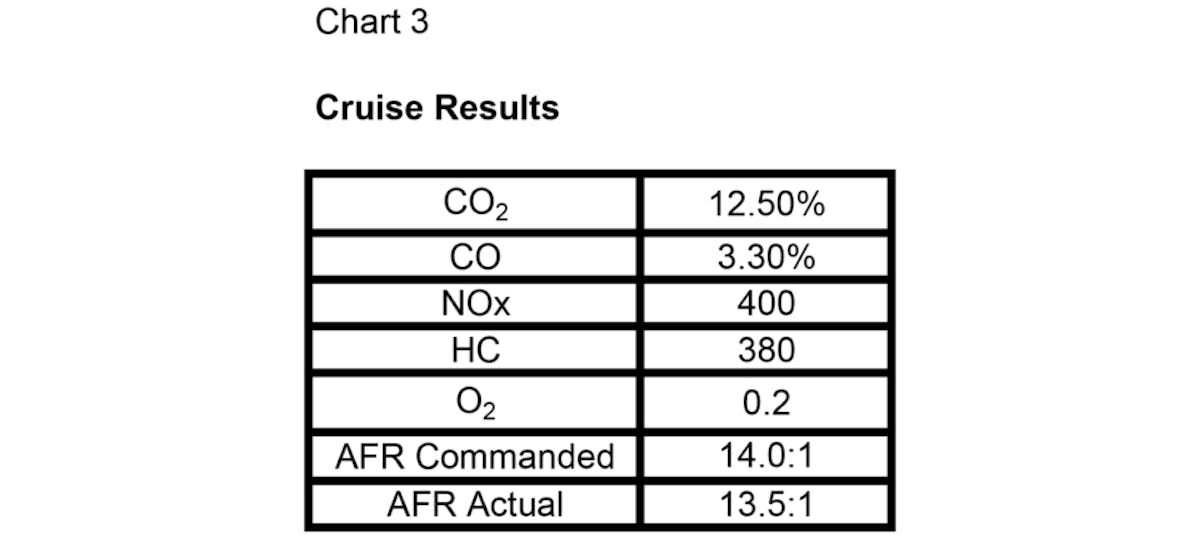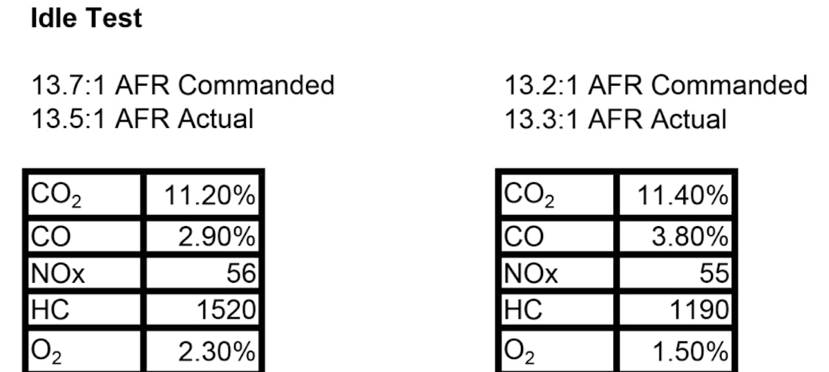 Chart 1 shows our results. We compared 13.7:1 to 13.2:1 and were surprised by the EMS machine’s report. As you can see, commanding a half-ratio richer 13.2:1 AFR resulted in a 22-percent reduction in HC combined along with a slight gain in CO2 and a positive reduction in O2. Granted, the CO2 gain was minimal—but since higher CO2 means we improved combustion efficiency—any gain is good. The AFR numbers at the end of each report are the measured AFR from the 5-gas machine, while at the top of each chart is the AFR requested from the Sniper. As you can see, they are very close.