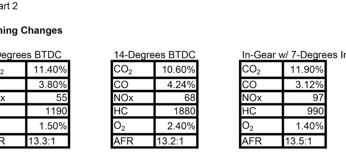 All of these tests were performed at idle with no load on the engine. Before this test began, we put the 700-R4 transmission into gear (with 7-degrees initial timing) and the numbers improved slightly, which is good because the engine will spend much more time idling in gear than it will in neutral. As mentioned in Part I, NOx is an indication of load and that with the engine idling in gear that the NOx increased. With numbers this good, we may leave the timing at 7- or 8-degrees initial and instead concentrate on experimenting with both the vacuum and mechanical advance curves.